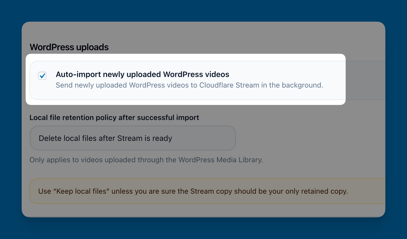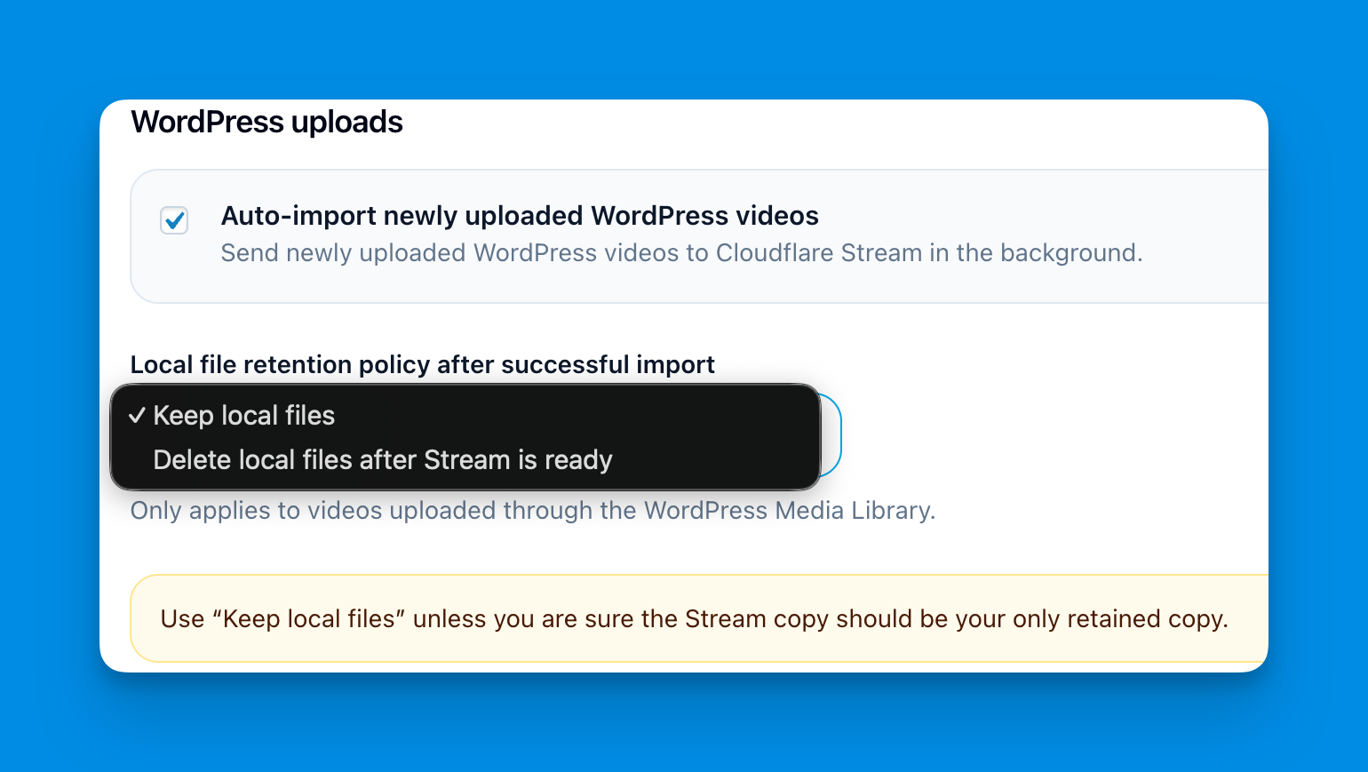 Keep videos in WordPress, in Cloudflare Stream, or in both at the same time depending on your needs.