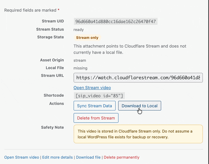 Recreate a local WordPress copy from Cloudflare Stream when a file has been removed or is no longer available.