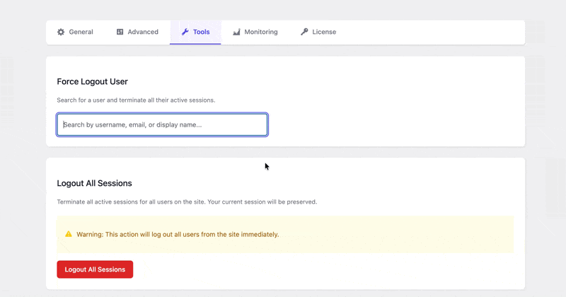 You can force logout for specific users, trigger site-wide logout actions, export and import settings, and use WP-CLI commands for automation. Multisite environments are supported, and monitoring or alert options help you keep track of session activity.