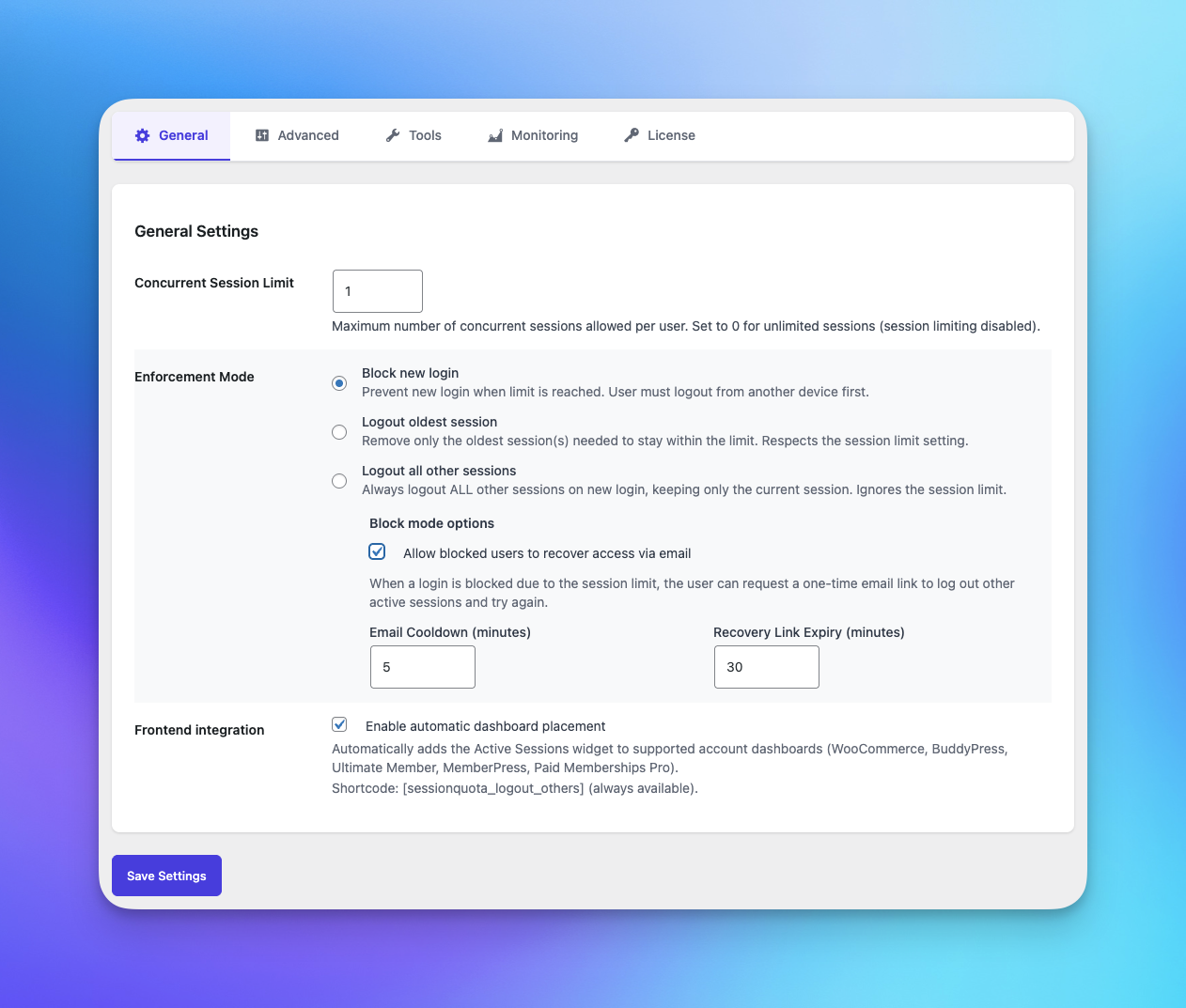 SessionQuota Pro includes three enforcement modes. Each mode controls what happens when a user reaches the allowed number of active sessions.