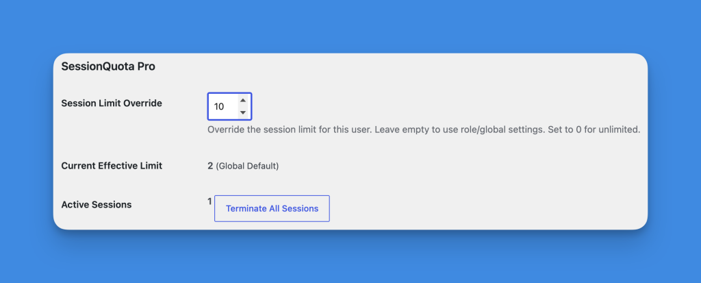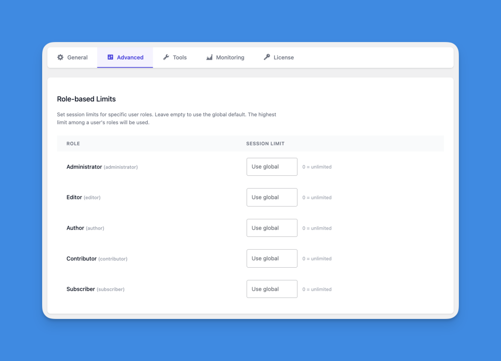 Role-based limits let you assign different session allowances to different WordPress roles.