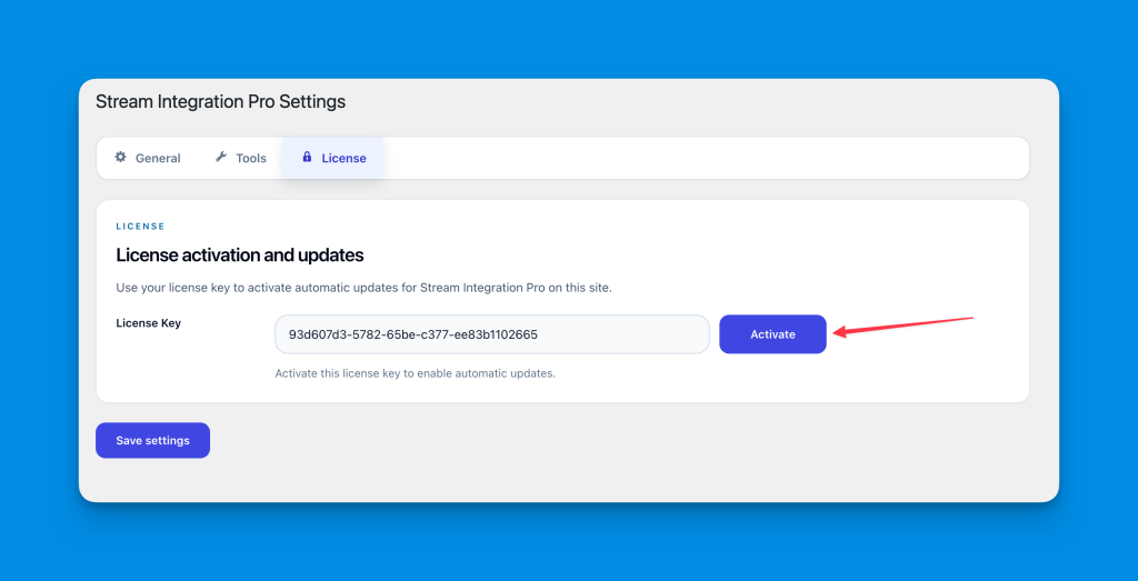 If the license is valid, the plugin will show a success message and, when available, the expiration date.